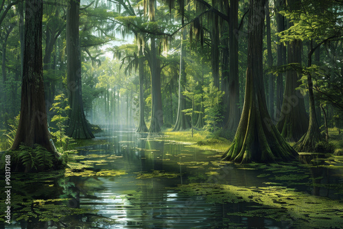 © Babb, Obraz premium A lush green forest with a river running through it