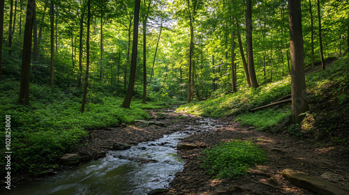 © GoldPumaze, Obraz premium A lush green forest with a sparkling stream running through it.
