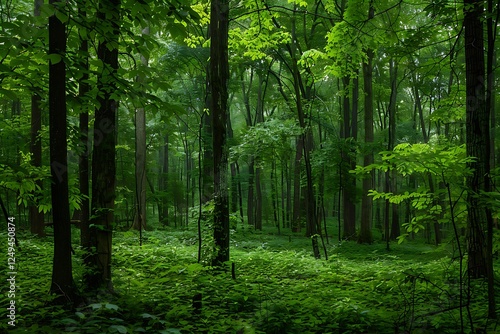 © tayyaba, Obraz premium A lush, green forest with a thick canopy, creating a cool, shaded environment on the forest floor.