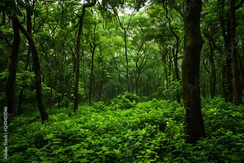 Obraz premium A lush, green forest with a thick canopy, creating a cool, shaded environment...