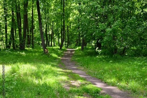 © Irina, Fototapeta premium a lush green forest with an empty path and sunlight