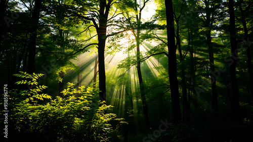 Fototapeta premium A lush green forest with rays of sunlight filtering through the trees