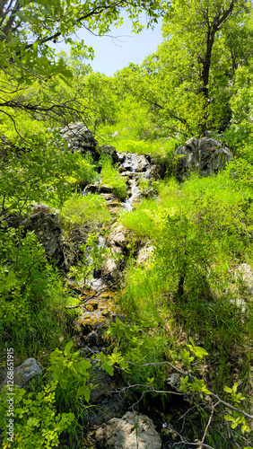 © Hawraman83, Obraz premium A lush green forest with rocks and a stream under a clear blue sky. 📍Hawraman Takht, Kurdistan