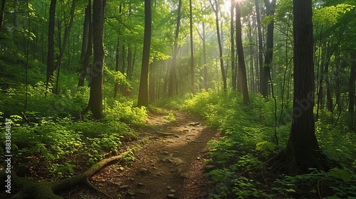 Obraz premium A lush green forest with sunlight filtering through the canopy onto a hiking...