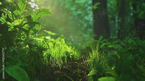 © Wongstorn, Fototapeta premium A lush green forest with sunlight shining through the trees