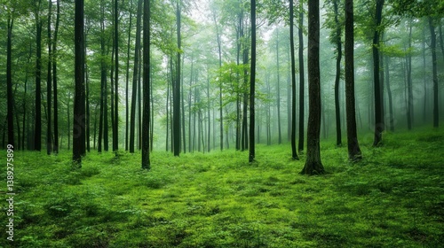 © berkah nikah, Fototapeta premium A lush green forest with tall trees in a misty atmosphere