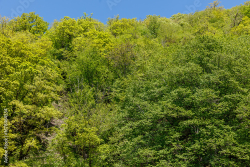 © schankz, Fototapeta premium A lush green forest with trees of various sizes