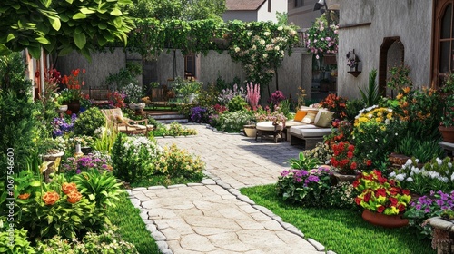 Naklejka premium A lush, green garden with a stone path leading to a patio with seating and...