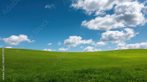 Fototapeta premium A lush green grassy field under a vibrant blue sky filled with fluffy white...