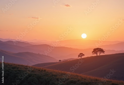 Obraz premium A lush green hill rises gently, adorned with a variety of trees, their leaves...