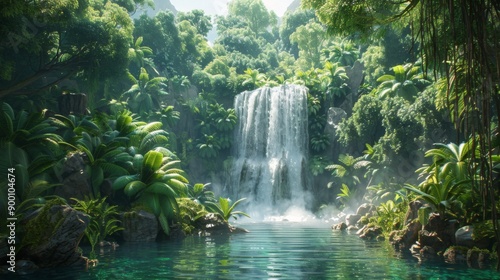 Fototapeta premium A lush green jungle with a waterfall cascading into a pool