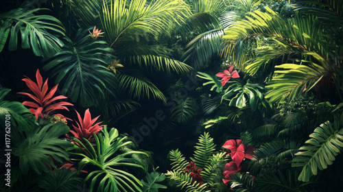 © tope007, Fototapeta premium A lush green jungle with red flowers