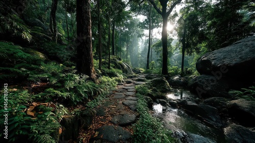 © Clint, Naklejka premium a lush green jungle with sunlight shining through the trees.stock image