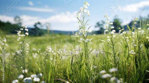 Obraz premium A lush, green meadow filled with tall grass and wildflowers