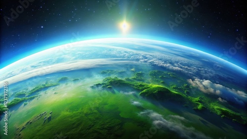 © Urenus Photos, Fototapeta premium A Lush Green Planet Viewed From Space, Sunrise Over Clouds and Islands