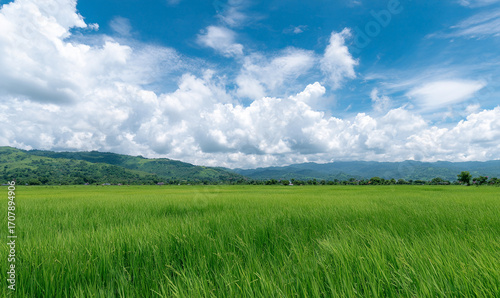 Obraz premium A Lush Green Rice Paddy Field Stretching Across a Peaceful Rural Landscape with Mountains in the Background Under a Bright Blue Sky Showcasing Traditional Farming Beauty. generative ai