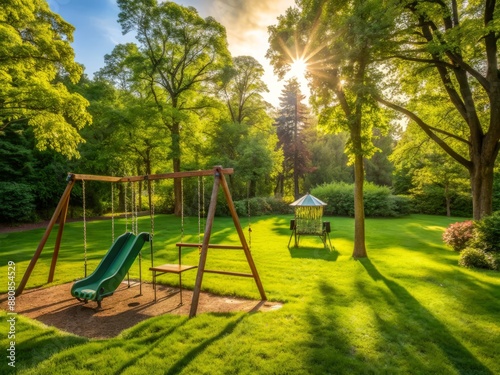 Fototapeta premium A lush green summer playground with a vacant swing set and slide, evoking a...