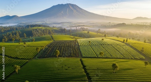 © RaNy, Fototapeta premium A lush, green tea plantation with a majestic mountain in the background.