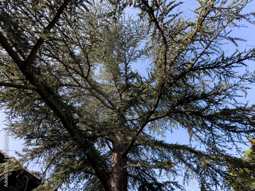 Fototapeta premium A lush green tree stretches skyward under a clear blue sky in a peaceful...