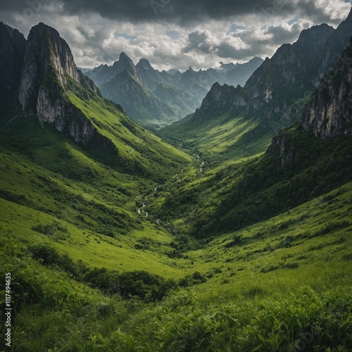 © Ghulam, Obraz premium A lush green valley between two towering peaks.