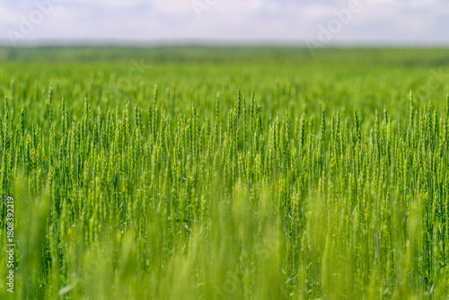 © beholdereye, Naklejka premium A Lush Green Wheat Field Flourishing Vigorously Under a Bright Blue Sky on a Beautiful Sunny Day
