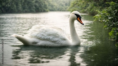 Fototapeta premium a lush greenery, a pure white swan floating in the water peacefully, its feathers ruffled by a gentle breeze
