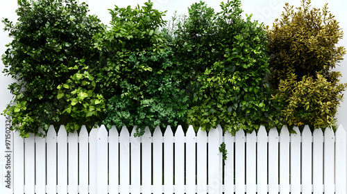 © Siasart, Fototapeta premium A lush hedge atop a white picket fence creates a vibrant garden scene.