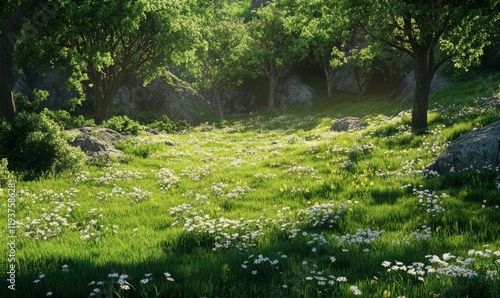 Obraz premium A lush meadow with a vibrant green grassy terrain on a sunny day, natural scenery, countryside scenery, wildflowers