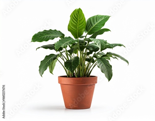 © Rahmat Hidayat, Obraz premium A lush Peace Lily with elongated deep green leaves in a reddish-brown clay pot