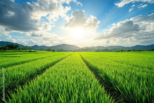 Fototapeta premium A lush rice paddy field with neat, under a bright, sunny sky, green rows stretching into the horizon , ai