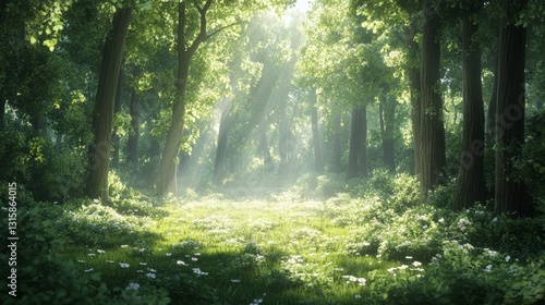 Naklejka premium A lush spring forest with sunlight streaming through the trees, fresh green...
