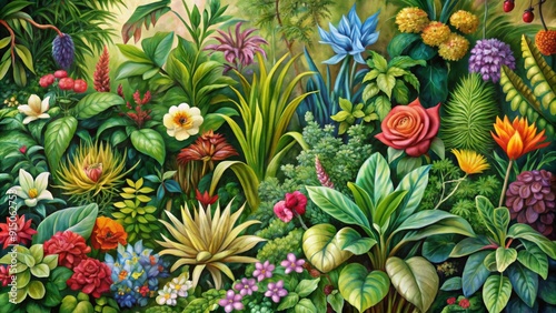 Fototapeta premium A Lush Tapestry of Tropical Blooms Oil Painting of a Vibrant Garden - Botanical Art, Tropical Flowers, Oil Painting, Nature, Garden Art, Flower Painting, Green