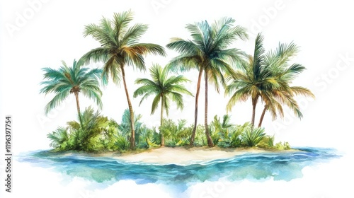 © Napasnan, Fototapeta premium A lush tropical island with tall watercolor palm trees and shimmering ocean waves, creating a peaceful scene, isolated on white