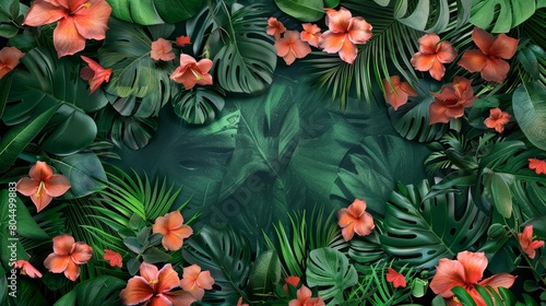 Naklejka premium A lush tropical paradise with vibrant red hibiscus flowers and lush green...