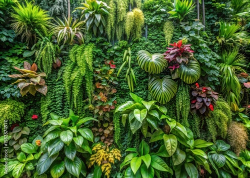 Fototapeta premium A lush vertical garden with vibrant greenery and exotic tropical leaves...