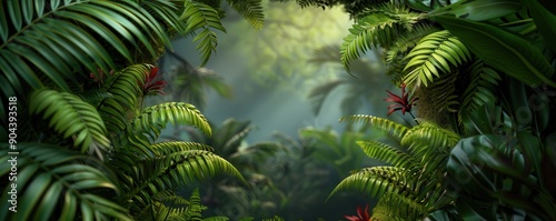 Fototapeta premium A lush, vibrant forest scene with sunlight filtering through dense foliage,...
