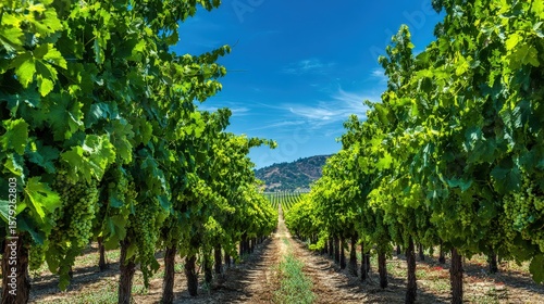Fototapeta premium A lush vineyard landscape in summer with symmetrical vine rows, full grape clusters, and clear blue skies overhead