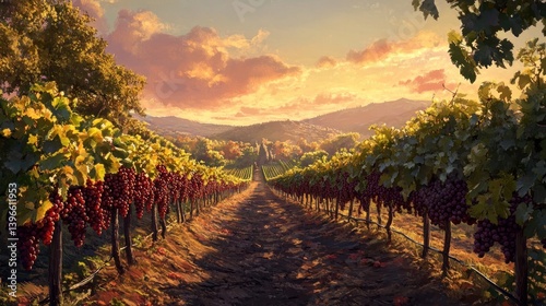 © Affan, Naklejka premium A lush vineyard with ripe grapes ready for harvest, --ar 16:9 --v 6.1 Job ID: 847dc74d-b349-4abd-a76d-1faf64e0d8ed