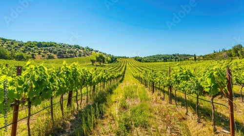 Naklejka premium A lush vineyard with rows of grapevines under a clear blue sky, with ample...