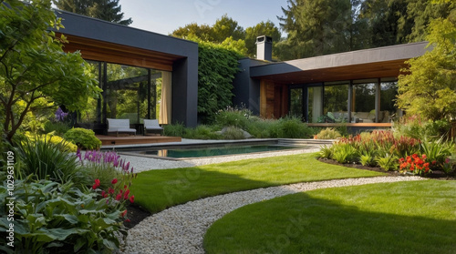 Naklejka premium a lush, well-maintained backyard garden with a vibrant green lawn as the central focus