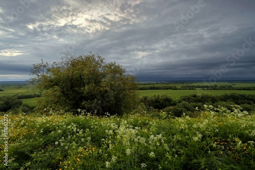 © Aleksandr 44ARH, Obraz premium A lush willow bush on a green hillside against a cloudy evening sky. summer landscapes