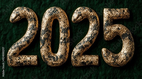© Aleksandra, Obraz premium A luxurious and elegant New Years greeting card design featuring a minimalist gold snake on a deep green background with intricate details and a bold 2025 in metallic typography