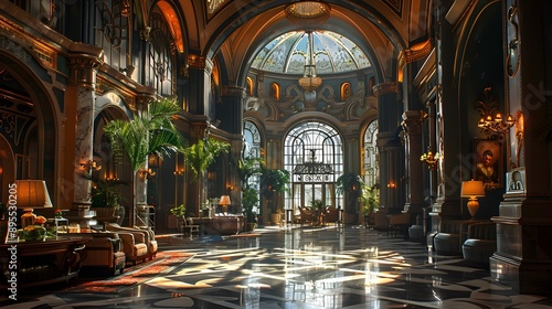 © Athena, Fototapeta premium A luxurious and elegantly designed hotel lobby with ornate architecture, rich colors, and natural light illuminating the space.