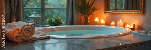 Fototapeta premium A luxurious bathroom scene, featuring soft lighting, a deep soaking tub, plush towels, and aromatic candles, creating an atmosphere of tranquility and self-care , bathroom design, bath products