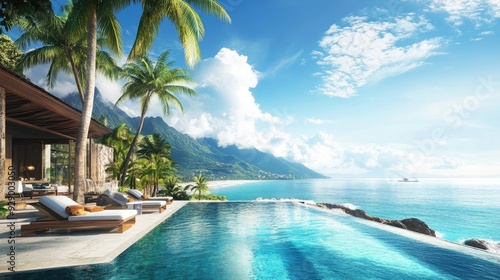 Fototapeta premium A luxurious beach resort with an infinity pool overlooking the ocean, with palm trees and sun loungers enhancing the tropical vibe.