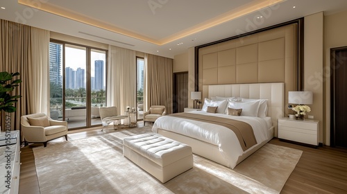 Fototapeta premium A luxurious bedroom with a king-size bed, a large window overlooking a city...