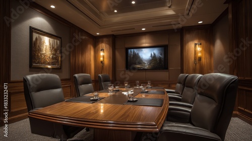 Fototapeta premium A luxurious boardroom with a large wooden table leather chairs and artwork on the wall
