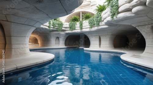 Obraz premium A luxurious cave pool with blue water, stone architecture, and tropical plants for a relaxing vacation and travel destination