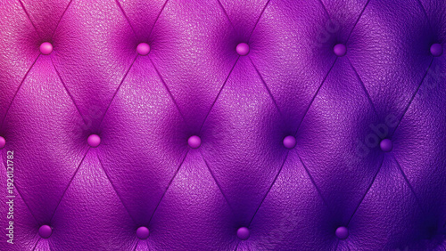 Fototapeta premium A luxurious, deep purple leather surface features a classic diamond-quilted pattern secured by matching buttons, finished with a sophisticated metallic sheen and rich, pebbled tactile texture