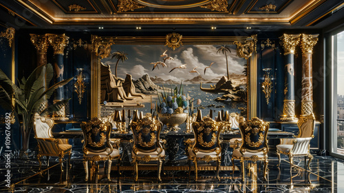 © RUK Collections, Obraz premium A luxurious dining room with a polished black marble table, golden chairs with Egyptian-inspired carvings, and a mural of the Nile River on the wall.